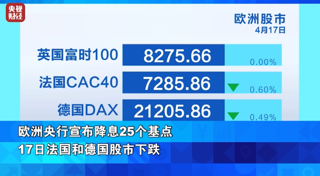 而另一边,欧洲央行周四宣布将三大关键利率分别下调25个基点。当天,英国股市基本收平,法国和德国股市则下跌,法国CAC40指数下跌0.60%,德国DAX指数下跌0.49%。
